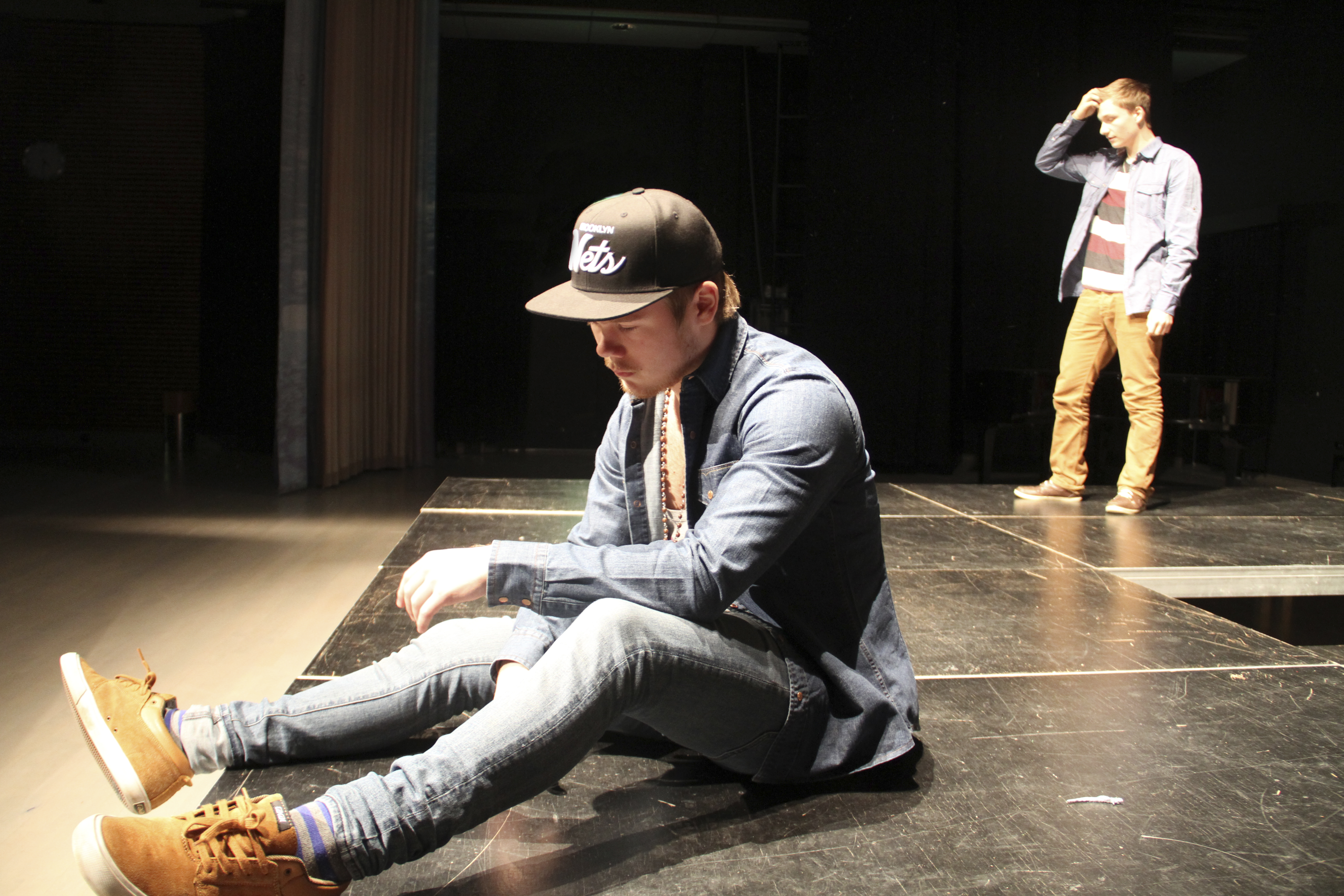 Sonny Kylä-Liuhala (vas.) ja Teemu Tenkanen näyttelevät Antti Pentikäisen kirjoittamassa pienoisnäutelmässä Poikien välisestä ystävyydestä. Kuva on joululomalla pidetyistä harjoituksista. Kuva: Antti Pentikäinen.