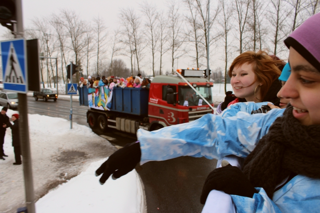Ajelimme pitkään. Käsi väsyi jopa vilkuttamaan. Onneksi sää oli leuto. Lapsia oli paljon. He imuroivat innokkaasti heittämämme karkit.