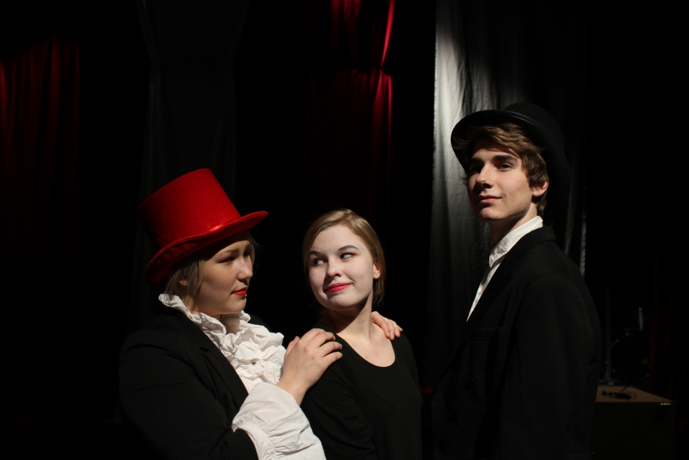 Maisa Jaaksola (Rose Alekan, sirkustirehtööri), Petra Ekroos (Mykkä klovni) ja Väinö Vasara (Saska Alekan, taikuripoika) näyttelevät päärooleja. Toisessa miehityksessä samoissa rooleissa nähdään ja kuullaan Aino Kallio, Rosa Nordström ja Olli Talsi. Kuva: Roosa Jarkko.