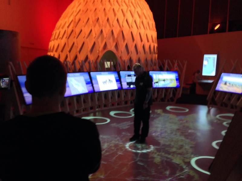 Opettajat tutustuivat myös Haltian upeisiin näyttelyihin sekä rakennuksen ekotekniikkaan. Porukka tapasi myös vanhan tutun eli Tilun entisen teknisen kouluisännän Seppo Kivenniemen, joka työskentelee nykyisin Haltian näyttelyteknikkona.