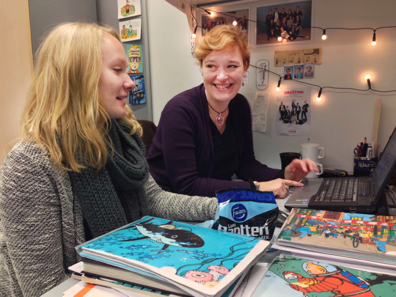 Opkh:n puheenjohtaja Ronja ja ohjaava opettaja Mila suunnittelevat tulevia seikkailuja. Kuva: Antti Pentikäinen.