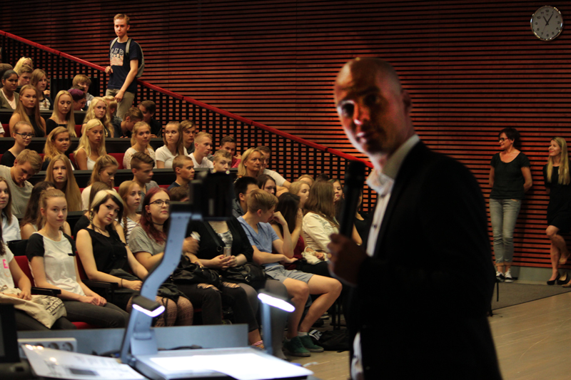 Ykkösillä, kakkosilla sekä abeilla ja pidentäjillä oli omat aloitustilaisuutensa auditoriossa. Kuva: Antti Pentikäinen.