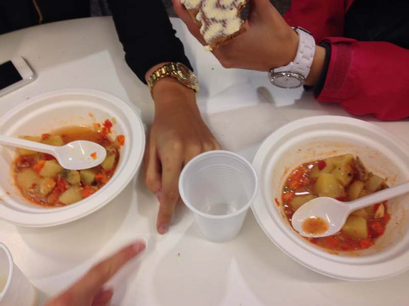 Maittava kalakeitto saatiin opiskelijoiden syötäväksi kahden keittiötyöntekijän voimin, eikä linjastoissa ollut edes ruuhkaa. Kuva: Antti Pentikäinen.