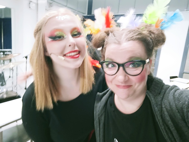 Jollain käsittämättömällä sinnikkyydellä laulut saatiin kuitenkin harjoiteltua. Kuvassa onnellinen pääosan esittäjä ja kuoronjohtaja ennen ensimmäistä näytöstä. Kun laittoi tarpeeksi glitteriä naamaan  ja sulkia päähän, oli laulukielto tuossa vaiheessa vain hailakka muisto matkan varrelta.