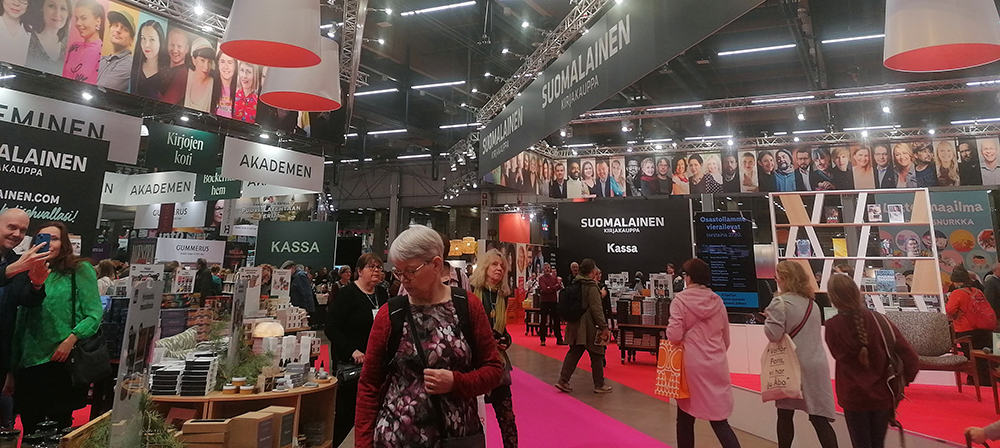 KÄVIMME MYÖS KIERTELEMÄSSÄ kolmen suurimman kirjakaupan kojuja, eli Akateemisen kirjakaupan, Suomalaisen kirjakaupan, sekä Rosebudin. Jokaisessa oli laaja kirjo erilaista kirjallisuutta eri kielillä, ja meidän oli hankalaa vetäytyä ostamasta itsellemme lisälukemista kirjahyllylle odottamaan vuoroaan. Totesimme kuitenkin, että olisi järkevämpää säästää rahat toistaiseksi, sillä haluamamme kirjat todennäköisesti löytyvät vielä myöhemmin näiden kirjakauppojen valikoimasta.