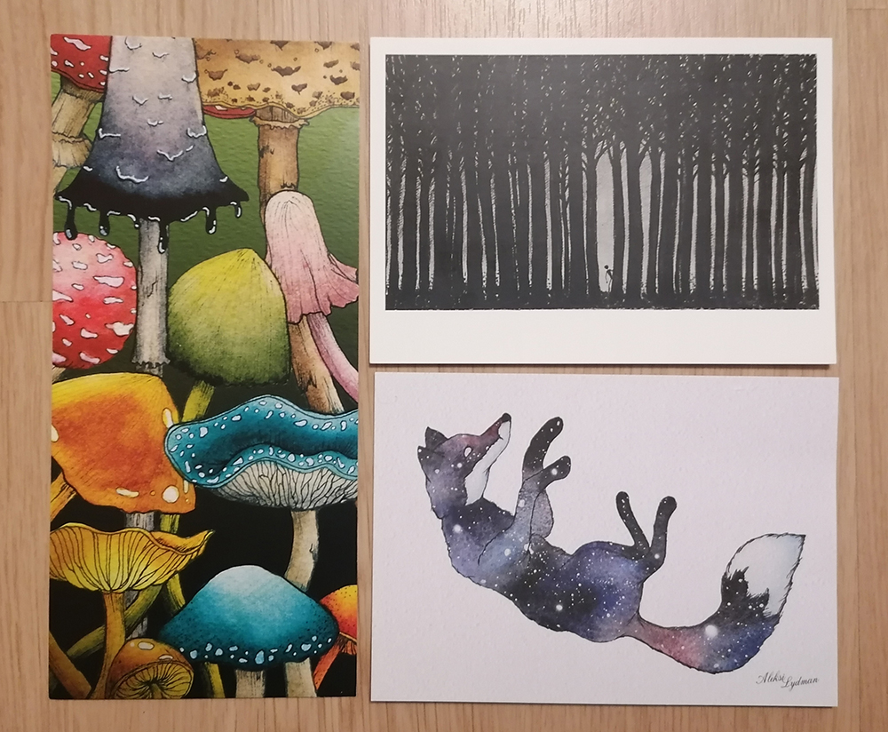 MEISTÄ OLI HIENOA, että messuilla oli tänä vuonna kojuja myös pienemmille yrityksille. Töölö-lavan lähellä oli pieniä kojuja, joissa yksittäiset yrittäjät olivat myymässä taidetta ja taideprinttejä muun muassa postikorttien ja kangaskassien muodossa. Joukossa näkyi esimerkiksi maailman suloisimpia kuvia eri eläimistä, kuten ketuista ja siileistä sekä häkellyttäviä illustraatioita avaruusmaisemista. Suurin osa pienyrittäjistä oli myös todella ystävällisiä ja anteliaita, ja hinnat olivat isompia ketjumyymälöitä edullisempia. Näiltä kojuilta lähti mukaan paljon postikortteja, joita lähetämme sukulaisille ja laitamme seinälle koristeeksi. On aina mukavaa tukea pieniä yrityksiä ja taiteilijoita.