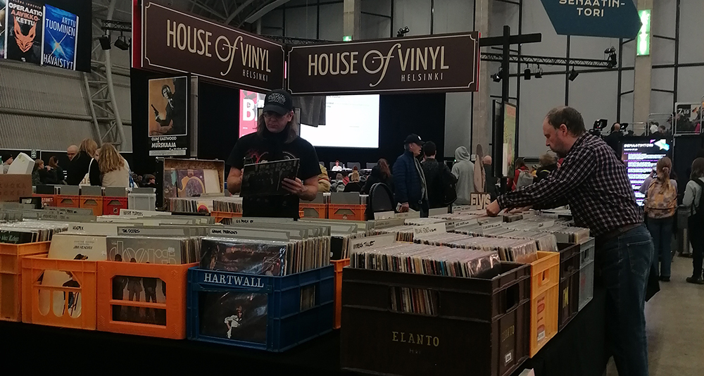 SAAVUIMME TÄPÖTÄYDELLÄ JUNALLA Pasilaan aamupäivällä, ja suuntasimme sieltä suoraan Messukeskukseen. Sinne suunnistaminen oli helppoa, sillä seurasimme vain suurta ihmisjoukkoa, joilla oli selkeästi sama määränpää. Sisällä oli suunnaton määrä ihmisiä, mutta tilaa riitti onneksi kyllin kaikille. Suunnittelimme aluksi menevämme Kruununhakaan Tiedetorille seuraamaan keskustelua merkittävästä filosofista Friedrich Nietzschestä, mutta siihen oli vielä aikaa, joten kiertelimme ensin Messukeskuksen perällä sijaitsevia levymessuja ja Kruununhaan lähellä olevia antikvariaatteja.