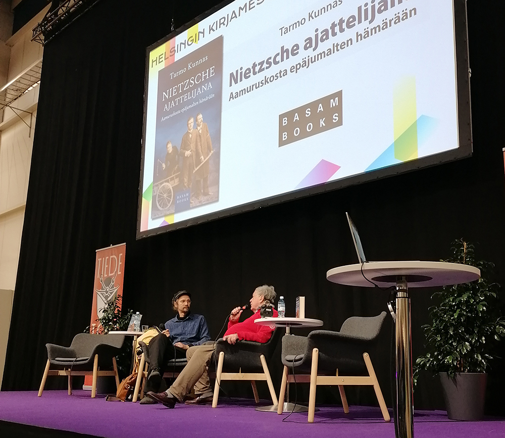 KELLON LYÖDESSÄ 11.30 Tiedetorilla oli mahdollisuus nähdä kirjailija ja professori Tarmo Kunnas. Hän on kuluttanut mielettömän määrän aikaa elämästään nimenomaan Nietzschen filosofisten teorioiden ja pohdintojen tutkimiseen sekä hänestä opettamiseen ja kirjoittamiseen. Kunnasta haastattelemassa oli Sampsa Laurinen. Haastattelun pohjalla oli Kunnaksen teos Nietzsche ajattelijana. Kunnas pistää paljon painoarvoa erityisesti Nietzschen huumorintajuun ja hänen kirjallisuutensa tulkitsemiseen huumorin eri lajityyppien näkökulmasta. Hän myös totesi, että Nietzsche oli elämänsä eri vaiheissa jopa hieman ristiriidassa omien ajatustensa kanssa. Haastattelu oli hyvin mielenkiintoinen.