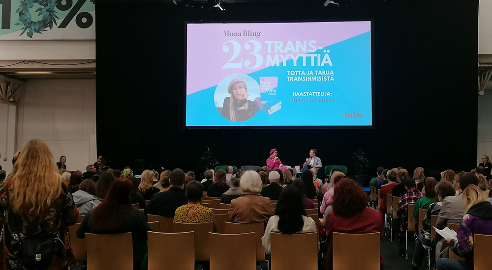 HAKANIEMI-LAVALLA kello 12.30 some-vaikuttaja, toimittaja sekä nykyään myös kirjailija Mona Bling oli puhumassa esikoisteoksestaan 23 transmyyttiä: Totta ja tarua transihmisistä. Blingiä haastattelemassa oli äänikirjaversion kanssanauhoittaja ja näyttelijä Miiko Toiviainen.