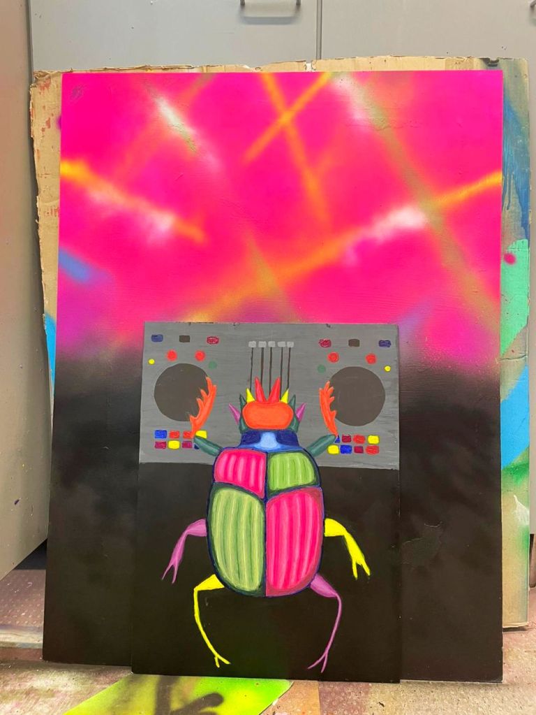 - Onnistuin erityisesti spray-maalaamisessa, joka on työn silein ja viimeistellyin osa. Itse ötökän maalaus DJ-kontrollerin kanssa on hieman sotkuinen.