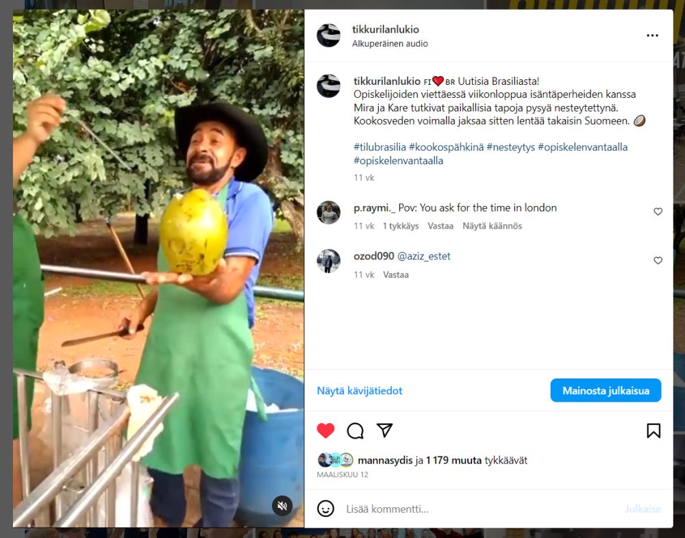 TÄNÄ VUONNA OLEMME SIIRTÄNEET julkaisemisen painopistettä yhä enemmän Instagramiin, jossa on ollut ennätysmäärä julkaisuja. Seuraajamäärä on noussut kohisten, ja teimme myös kaikkien aikojen ennätyksen. Yksi kela on saanut lähes 1200 tykkäystä ja sitä on lakkiaispäivänä katsottu peräti 170101 kertaa! Kyse on Mira Poijärven Brasilian-opintomatkalla kuvaama video, jossa katukauppias leikkaa veitsellä kookospähkinästä drinkin.