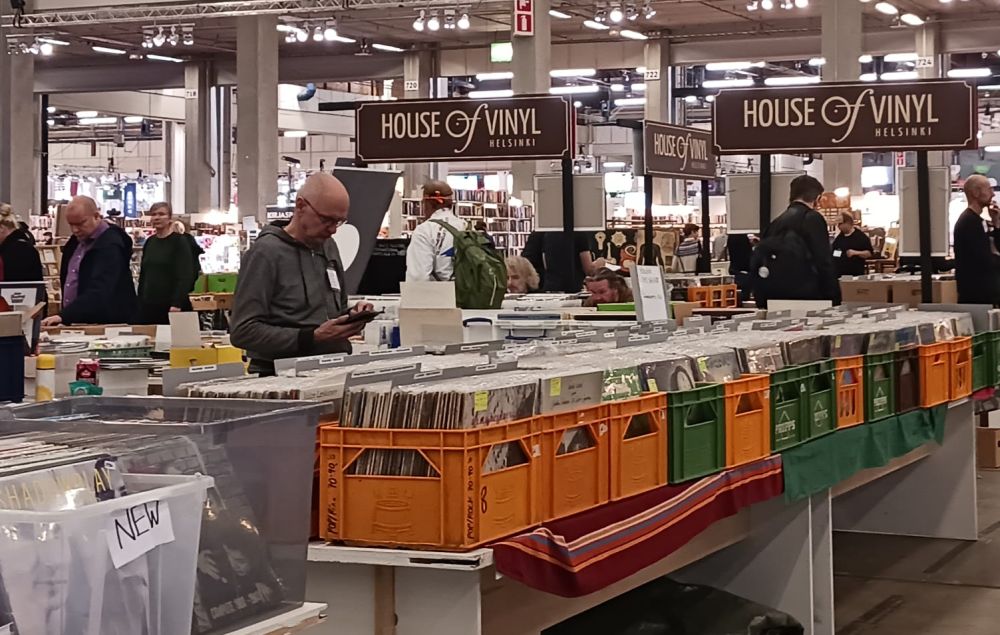 Evästauon jälkeen suuntasimme eteenpäin levymessualueelle. Levymessuilta löytyi paljon kiinnostavaa musiikinystäville: vinyylejä, CD-levyjä, julisteita ja bändipaitoja. Tältä alueelta löytyi kaikenlaisia levyjä käytetyistä kasarilevyistä uusimpiin hitteihin. Meitä yllätti halpojen löytöjen määrä.