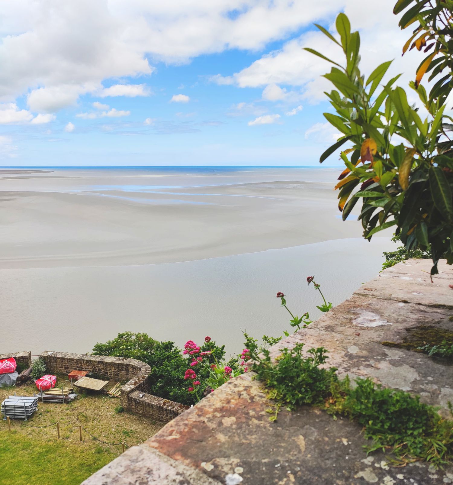 Mont Saint Michelin luostarisaari on erikoinen nähtävyys. Tämä keskellä tasaista maastoa sijaitseva korkea saari oli suuri ihmetys minulle. Miten tällainen on voinut syntyä? Vaikka paikka on oikeasti todella hieno, Google Mapsista katsomani kuvat asettivat odotukseni korkealle. Käytännössä saari ei ainakaan tänään ollut saari. Odottakaas kun selitän… Paikka sijaitsee aivan vuorovesialueen ympäröimänä. Vuorovesi vaikuttaa siihen, kuinka korkealla veden pinta on alueella, ja tilannetta kuvataan vuorovesikertoimen avulla, jonka arvo vaihtelee 20 ja 120 välillä. Mitä korkeampi kerroin on, sitä korkeammalla vesi on. Yli 90:n kerroin vastaa korkeaa vuorovettä, kun taas yli 118 on jo vuosisadan vuorovedeksi, jolloin saari on todella meriveden ympäröimänä. Kun me kävimme saarella, kerroin oli 34, eli vesi oli matalalla.