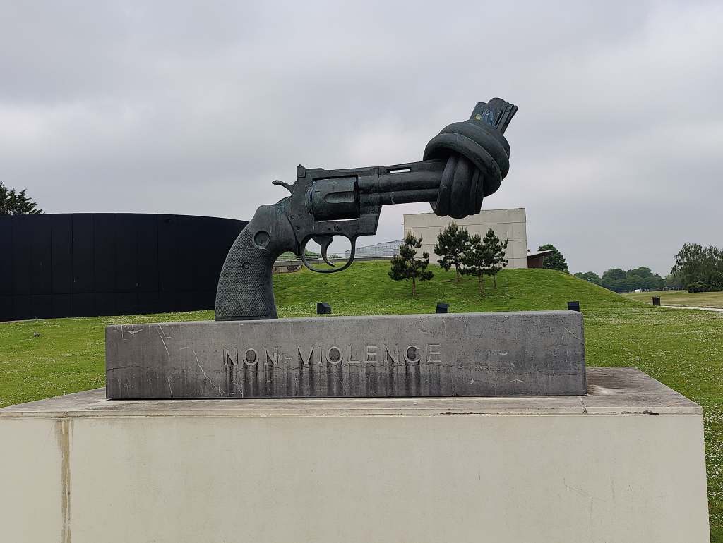 REILUN VIIKON MITTAINEN KULTTUURIVAIHTO on loppusuoralla, ja edessä on miltei kymmenen tunnin matkustus Suomeen. Ennen bussin lähtemistä perheeni haluaa näyttää vielä yhden nähtävyyden, joka sekin on kaatuneiden amerikkalaisten muistomerkki. Löysin muistomerkiltä veistoksen, joka kuvaa asetta, jonka piippu on laitettu solmuun. Alla lukee NON-VIOLENCE. Mieleeni herää kysymys siitä, miksi emme voi elää maailmassa, jossa ei ole sotia.